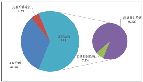 對2019年151.4萬份進行統(tǒng)計分析,按照給藥途徑,可以看到注射給藥占了62.8%,這其中92.5%是靜脈注射給藥所造成的不良反應(yīng),而其他注射給藥僅占7.5%。