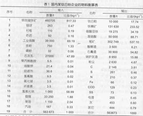 由表l知,該鈦白粉企業(yè)全年生產(chǎn)輸入的物料共18項(xiàng),總量為5 63 673 t。其中,資源有1 5項(xiàng),其輸入量為529 086 t,占輸入物料量的93.8 6%;能源有3項(xiàng),其輸入量為3 4 5 8 7 t,占輸入物料量的6.1 4%。該鈦白粉廠全年生產(chǎn)輸出的物料共1 7項(xiàng)。其中,鈦白粉為主產(chǎn)品,硫酸亞鐵為副產(chǎn)品,鐵精礦將直接用作鋼鐵生產(chǎn)。這3項(xiàng)加在一起,得輸出的“產(chǎn)品’’量為1 60 905 t,占輸出物料量的2 8.5 7%;其余輸出為廢棄物,共1 4項(xiàng),總量為402 424 t,占輸出物料量的7 1.43%。