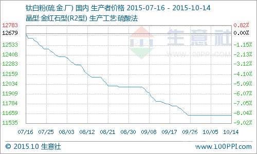 10月13日鈦白粉(硫.金.廠)商品指數(shù)為55.26,與昨日持平,創(chuàng)下周期內(nèi)的歷史新低,較2011年09月04日最高點(diǎn)100.00點(diǎn)下降了44.74%。(注:周期指2011-09-01至今)