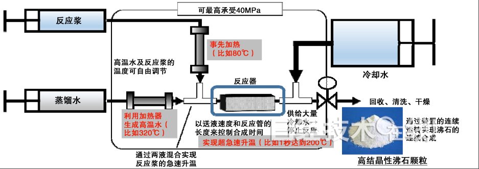 該系統(tǒng)以工業(yè)利用價值高的MFI型沸石為對象,急速加熱事先熟化至即將結(jié)晶水平的合成原料混合液。MFI型沸石一般在150℃左右的溫度下經(jīng)大約12小時形成結(jié)晶,而此次研究發(fā)現(xiàn),在260℃下只需約6秒即可合成。