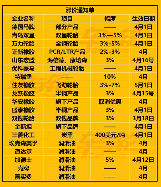 在原材料價(jià)格漲價(jià)的情況下,不少輪胎企業(yè)發(fā)布了4月份的漲價(jià):