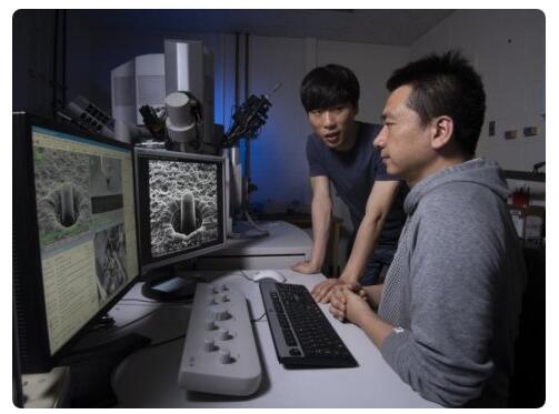 普渡大學的研究人員首次發(fā)現(xiàn),陶瓷在電場下受到較高壓縮應(yīng)變量時,將發(fā)生塑性變形而非脆斷。(圖為:研究生助理Jaehun Cho和李強。圖片來源:普渡大學影像/ Vincent Walter)