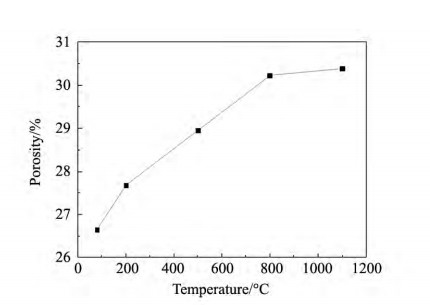 脫膠工藝是影響燒結工藝的重要工藝過程,當坯體經(jīng)80℃烘干后,坯體的氣孔率為26.65%;隨著脫膠溫度的升高,素坯的氣孔率增加,當溫度升高到800℃ 時氣孔率為30.23%,繼續(xù)升高溫度氣孔率增加不明顯。從節(jié)能的角度考慮,確定脫膠溫度為800℃,該條件下獲得的素坯具有較高的氣孔率和滲硅通道,有利于促進硅和炭的充分反應。
