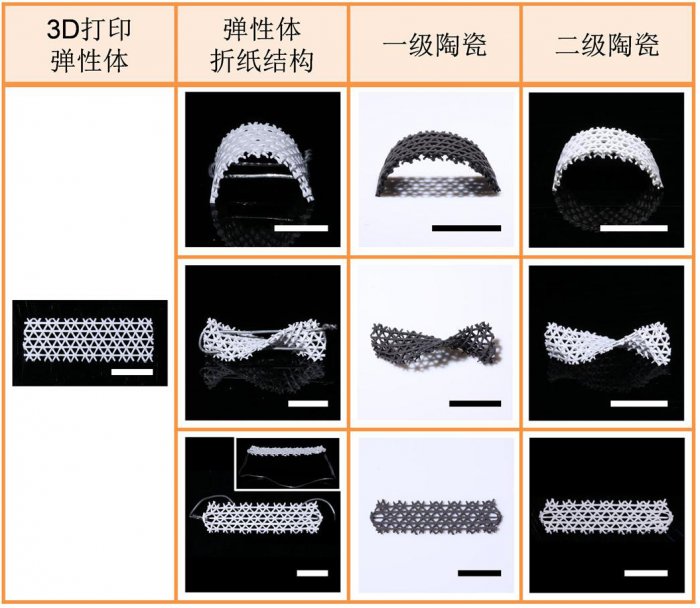 呂堅(jiān)研究組的這種打印技術(shù)采用復(fù)合彈性體陶瓷材料,完成了從3D打印到結(jié)構(gòu)可變形的過程,實(shí)現(xiàn)了陶瓷折紙結(jié)構(gòu)的打印和4D陶瓷打印。