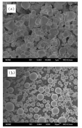 (a)—鎢粉原料;(b)—高頻熱等離子體球化后產(chǎn)品