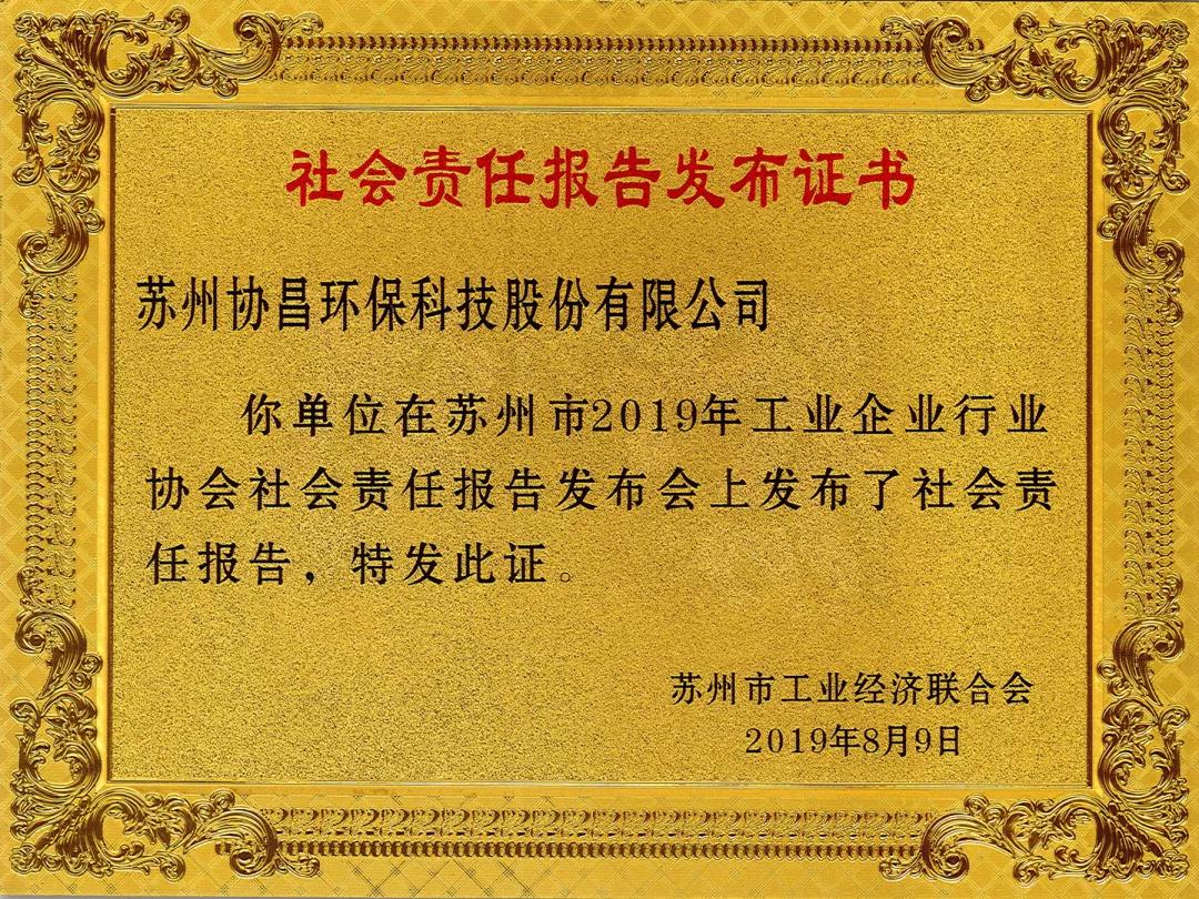 8月9日,蘇州市2019年企業(yè)行業(yè)協(xié)會(huì)社會(huì)責(zé)任報(bào)告發(fā)布會(huì)隆重舉行。發(fā)布會(huì)上向協(xié)昌環(huán)保等企業(yè)頒發(fā)了社會(huì)責(zé)任報(bào)告發(fā)布證書。