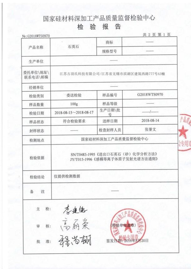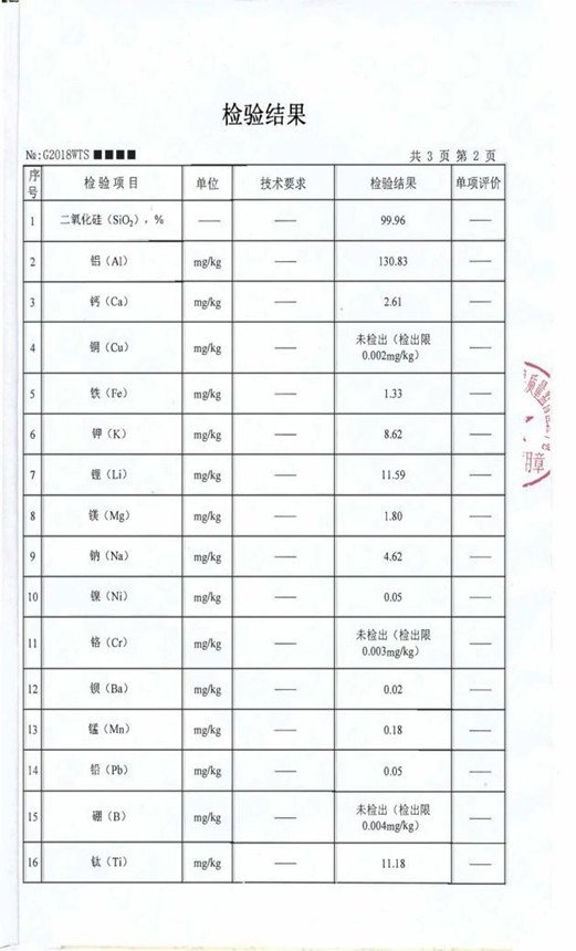 將樣品送樣給權(quán)威檢測部門進行檢測,總體來看,整個礦的石英礦石硅含量在99.96%以上,其中鐵、鈷、鎳等過渡族元素,鉀、鈉、鋰等堿金屬元素和硼元素含量較低,達到了較高的品位。