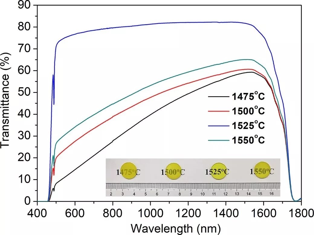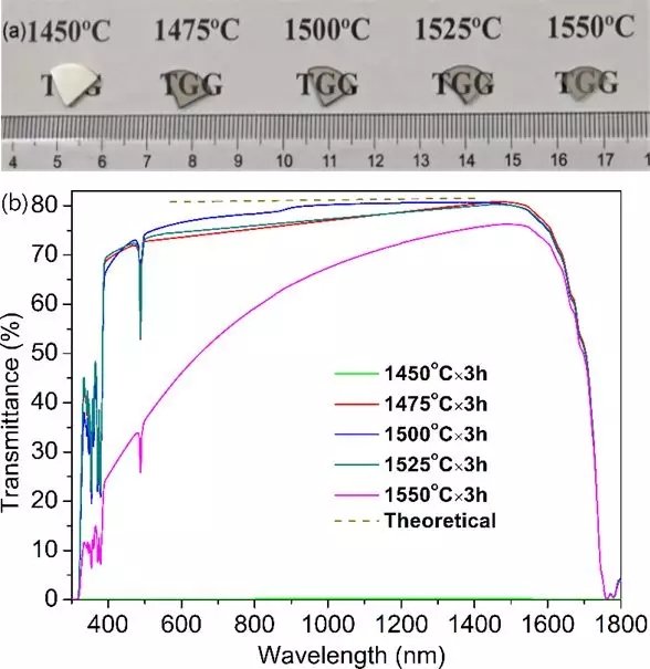 不同溫度制備的TGG磁光陶瓷的實物照片(a)與直線透過率曲線(b)