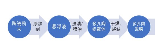 固態(tài)粒子燒結(jié)法是一種較常見的無機(jī)陶瓷膜制備方法,燒結(jié)流程如下,