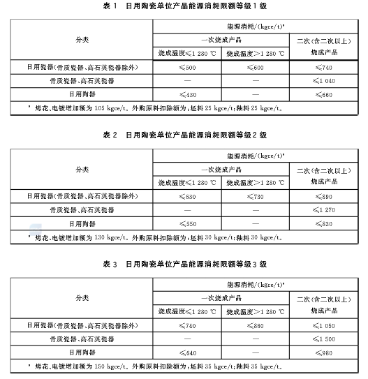 日用陶瓷產(chǎn)品生產(chǎn)企業(yè)的單位產(chǎn)品 消耗限額等級見表1、表2和表3。其中1級能源能耗最低。