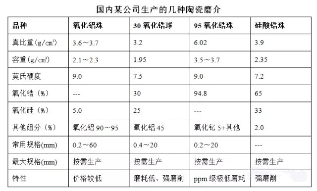 事實上,這種輕質(zhì)研磨體,在水泥行業(yè)以外早已存在,但大部分用于價值較高產(chǎn)品的超細粉磨,而且球磨機的規(guī)格比水泥行業(yè)要小得多。國內(nèi)某公司生產(chǎn)的幾種陶瓷磨介及其性能如下表所示。