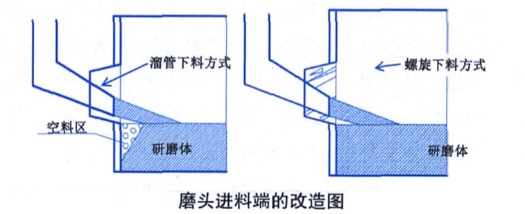 磨機大型化后,進料部分往往是溜管下料形式,由于落差大,在一倉磨頭端形成了物料沖料的現(xiàn)象,0.3m~0.5m部分形成“死區(qū)”,沒有物料或者球多料少,球磨機一倉做功區(qū)域縮短、倉位利用率降低。如果改為螺旋進料方式,效果較好。