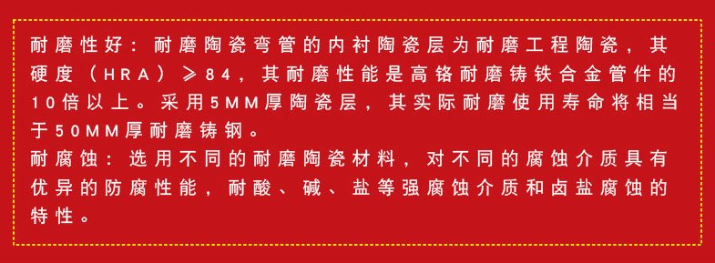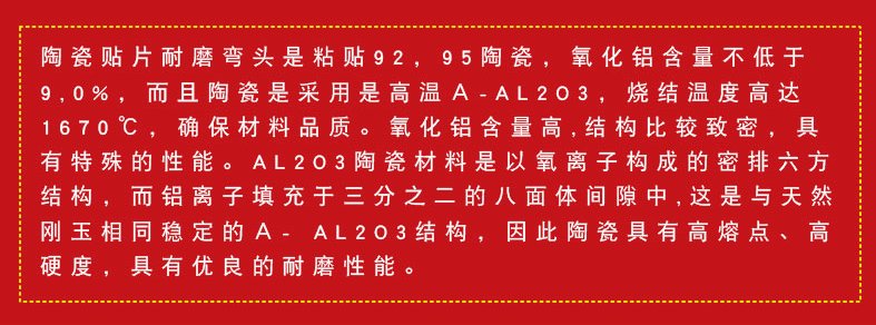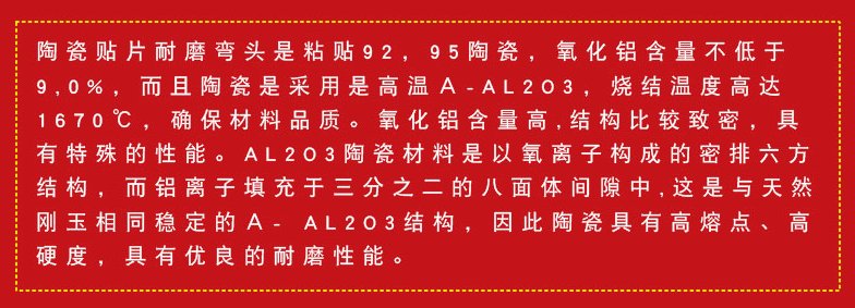 耐磨陶瓷復(fù)合管經(jīng)高溫?zé)Y(jié),結(jié)構(gòu)致密,研磨除毛刺處理后表面光潔。陶瓷復(fù)合彎管內(nèi)壁平整光滑不堵粉料。
