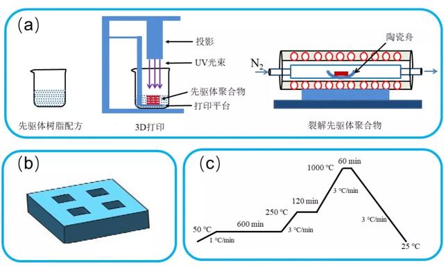 不同于傳統(tǒng)的以陶瓷粉末燒結(jié)為原理的增材制造工藝,先驅(qū)體陶瓷增材制造技術(shù)是將有機(jī)高分子先驅(qū)體材料通過(guò)激光光束照射,經(jīng)過(guò)“固化交聯(lián)”和“高溫?zé)崃呀狻钡冗^(guò)程,最終轉(zhuǎn)化為無(wú)機(jī)陶瓷。整個(gè)工藝是一個(gè)由“有機(jī)的液態(tài)的高分子先驅(qū)體材料”轉(zhuǎn)化為“無(wú)機(jī)的固態(tài)陶瓷材料”的過(guò)程,實(shí)現(xiàn)了有機(jī)物制備無(wú)機(jī)陶瓷材料,可以實(shí)現(xiàn)復(fù)雜陶瓷零件的一體化制造,兼顧精度、效率和成本。