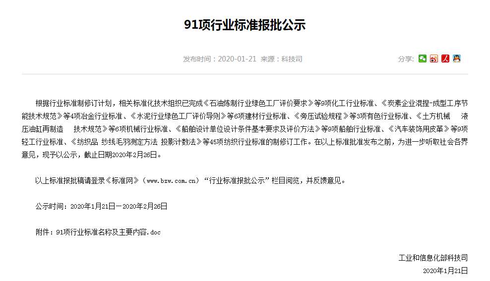 在以上標(biāo)準(zhǔn)批準(zhǔn)發(fā)布之前,為進(jìn)一步聽取社會(huì)各界意見,現(xiàn)予以公示,截止日期2020年2月26日。