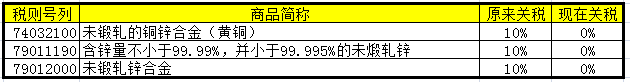 相關(guān)征稅產(chǎn)品清單中,與鋅相關(guān)的產(chǎn)品包括未鍛軋的銅鋅合金、含鋅量不小于99.99%,并小于99.995%的未煅軋鋅以及未鍛軋鋅合金,對(duì)于該三類商品暫不加征關(guān)稅。