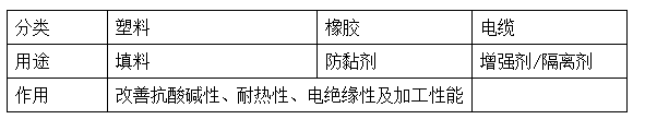 化工:化工工業(yè)塑料、噴漆業(yè)去毒、橡膠填料等;