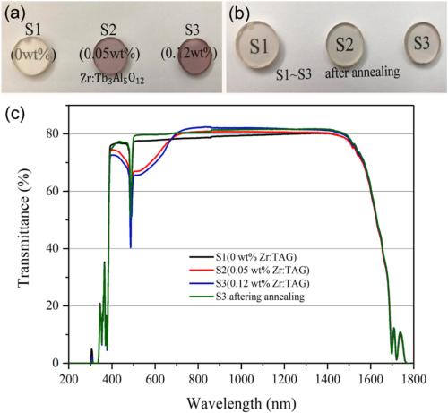 鋱鋁石榴石基透明陶瓷因其優(yōu)異的磁光性能、高熱導(dǎo)率和高激光損傷閾值等優(yōu)勢(shì),在高功率法拉第磁光隔離器中具有重要的應(yīng)用前景。但是,由于在透明陶瓷制備過(guò)程中,極易形成封閉氣孔、雜質(zhì)殘留和晶界相等散射源,從而導(dǎo)致高功率激光輻射下嚴(yán)重的熱吸收效應(yīng),造成器件的隔離度大大降低甚至損壞器件或激光系統(tǒng)。對(duì)鋱鋁石榴石陶瓷光學(xué)質(zhì)量的提高和散射中心的消除是目前鋱鋁石榴石基磁光陶瓷研究的焦點(diǎn)。研究團(tuán)隊(duì)突破常規(guī),通過(guò)引入ZrO2作為燒結(jié)助劑,在優(yōu)化真空燒結(jié)中的升溫和保溫機(jī)制的基礎(chǔ)上,得到了具有極大尺寸晶粒(~400um)和高光學(xué)透過(guò)率的Zr:TAG磁光陶瓷。