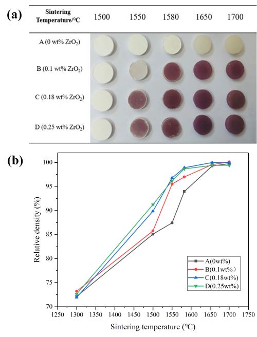 圖1 不同溫度燒結(jié)12小時(shí)后Zr:TAG的樣品形貌和致密化曲線