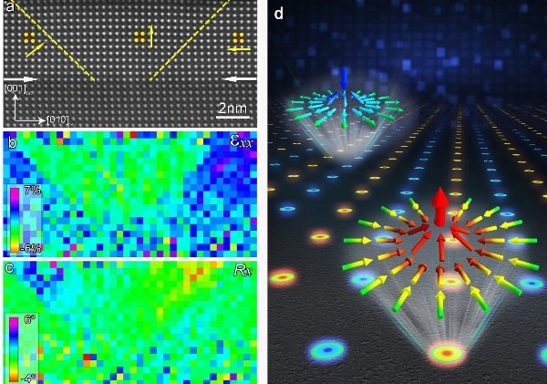 拓?fù)洚牻Y(jié)構(gòu)具有拓?fù)浔Wo(hù)性,可使數(shù)據(jù)得以長(zhǎng)時(shí)間保存,在非易失性信息存儲(chǔ)方面具有重要應(yīng)用價(jià)值。然而,鐵電材料中的拓?fù)洚犚话愣及倔w對(duì)稱性不允許的連續(xù)極化旋轉(zhuǎn)。如何突破鐵電極化與晶格應(yīng)變的相互制約,實(shí)現(xiàn)極化反轉(zhuǎn)與晶格應(yīng)變的有效調(diào)控,獲得有望用于超高密度信息存儲(chǔ)的結(jié)構(gòu)單元,是當(dāng)今鐵電材料領(lǐng)域面臨的一個(gè)基礎(chǔ)性科學(xué)難題。