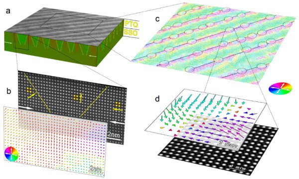 圖1:外延生長(zhǎng)在SmScO3襯底上的PbTiO3超薄膜中會(huì)聚型半子的面內(nèi)應(yīng)變和晶格旋轉(zhuǎn)信息(a, b, c);會(huì)聚型和發(fā)散型半子交替排列所形成的周期性半子晶格示意圖(d)。
