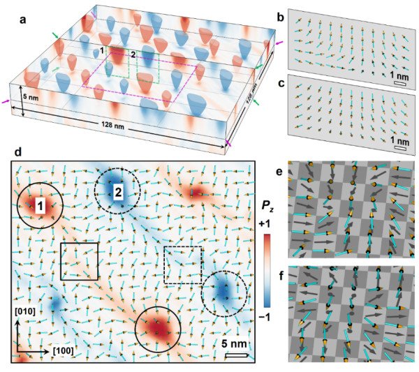 圖3:半子晶格的相場(chǎng)模擬結(jié)果。(a)三維展示圖;(b, c)匯聚型和發(fā)散型半子的截面極化矢量圖;(d)半子和反半子的平面極化矢量圖;(e, f)圖d中兩個(gè)半子的三維極化矢量圖。