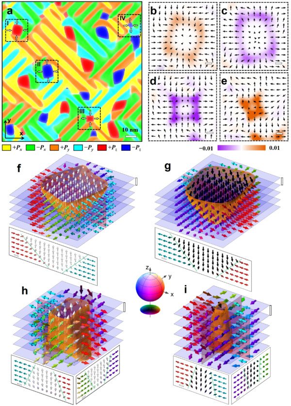 圖4:隨機(jī)半子模型的相場(chǎng)模擬結(jié)果。(a)水平截面圖;(b-e)圖a中四個(gè)區(qū)域的極化矢量和拓?fù)涿芏确植紙D;(f-i)這四個(gè)拓?fù)洚牻Y(jié)構(gòu)的三維極化矢量圖。