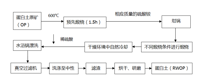 劉陽(yáng)鈺等在《蛋白土硫酸銨煅燒增白工藝研究》一文中,首次采用預(yù)先煅燒的方法去除蛋白土中有機(jī)雜質(zhì)并將其中所含有的鐵元素轉(zhuǎn)化為Fe2O3,然后采用硫酸銨煅燒法來(lái)增白預(yù)先煅燒后的蛋白土。