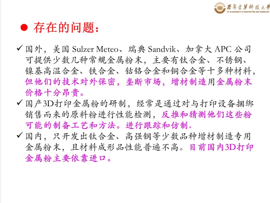 接下來陳強研究員介紹了3D打印金屬粉末存在的問題,國外的幾家公司可提供少數(shù)幾種常規(guī)金屬粉末,但他們的技術(shù)對外保密,壟斷市場,增材制造用金屬粉末價格十分昂貴,而國產(chǎn)3D打印金屬粉末研制比較困難,只開發(fā)出少數(shù)幾種粉末,且材料成型品性能普遍不高,目前國內(nèi)3D打印金屬粉末主要依靠進口。