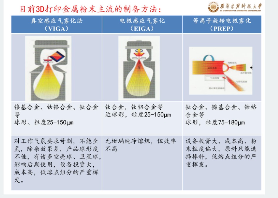 陳強研究員首先闡述了3D打。ㄔ霾闹圃欤┑母拍睢3D打印金屬粉末的特點,他介紹了目前3D打印金屬粉末的主流制備方法,包括電極感應(yīng)熔化氣體霧化EIGA、等離子惰性氣體霧化PIGA、旋轉(zhuǎn)電極霧化PREP、可控等離子體球化法和混合等離子體炬法PA,具體比較了幾種制備方法的優(yōu)缺點。