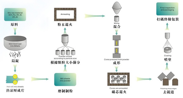合金磁粉芯是由鐵基合金材料制成的粉末,經(jīng)表面絕緣包覆與無機(jī)粘合劑混合壓制然后再進(jìn)行高溫處理而成的一種軟磁材料。依據(jù)其合金成分的不同,主要有鐵硅鋁磁粉芯(Sendust Cores)、硅鐵磁粉芯(Si-Fe Cores)、鐵硅鎳磁粉芯(Neu Flux Cores)、高磁通鐵鎳磁粉芯(High Flux Cores)、鐵鎳鉬磁粉芯(MPP Cores)五大類。