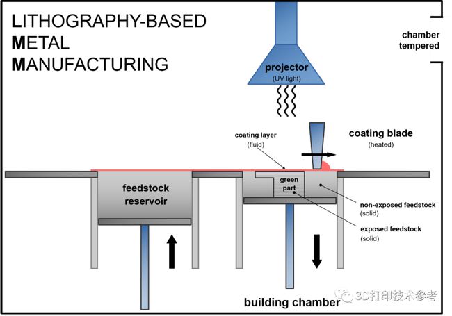 LMM技術(shù)根據(jù)光聚合原理生產(chǎn)高精度零件生坯,其原料為金屬粉末和光敏聚合物的混合體。通過掩模曝光,可以精確快速地成型整個(gè)層面,聚合物粘結(jié)劑選擇性的在局部交聯(lián),將金屬粉末粘結(jié)在一起。打印完的生坯經(jīng)歷脫脂和燒結(jié)后可以形成致密化的零件。