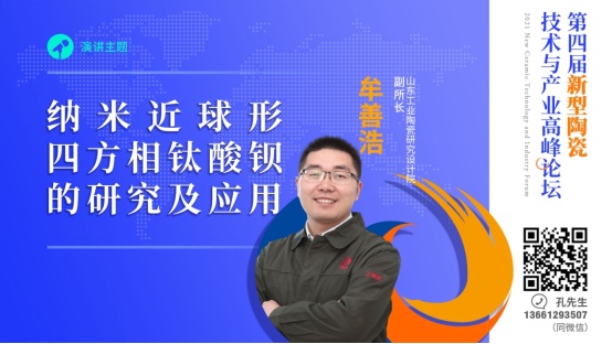 中國粉體網(wǎng)將在鄭州舉辦“2021第四屆新型陶瓷技術(shù)與產(chǎn)業(yè)高峰論壇”。屆時,來自山東工業(yè)陶瓷研究設(shè)計院功能陶瓷研究所的牟善浩副所長帶來題為《納米近球形四方相鈦酸鋇的研究及應(yīng)用》的報告。(鑒于當(dāng)前防控需要,原定于2021年8月13-14日在鄭州喆鵬酒店舉辦的“第四屆新型陶瓷技術(shù)與產(chǎn)業(yè)高峰論壇”將延期舉辦,計劃參會的單位可以聯(lián)系會務(wù)組,具體舉辦日期主辦方確定后將第一時間通知您)。