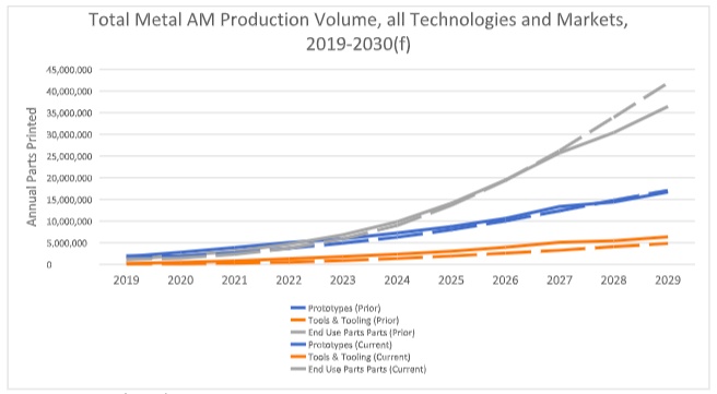 SmarTech總結(jié)說,2020年模具領(lǐng)域的活動有所增加,服務(wù)提供商和 "用于模具生產(chǎn)的3D打印高級用戶 "依靠金屬3D打印作為大流行病造成的生產(chǎn)停止和延誤的權(quán)宜之計。此外,除了牙科行業(yè)外,整個2020年,金屬3D打印的最終用途零件生產(chǎn)也在增加。