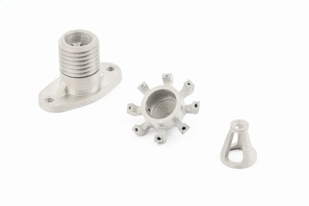 ▲從左到右,一個無人機聯(lián)軸器,一個燃料噴射器噴嘴,以及一個用Studio System 2 3D打印的鈦制望遠(yuǎn)鏡聚焦環(huán)。圖片由Desktop Metal公司提供。