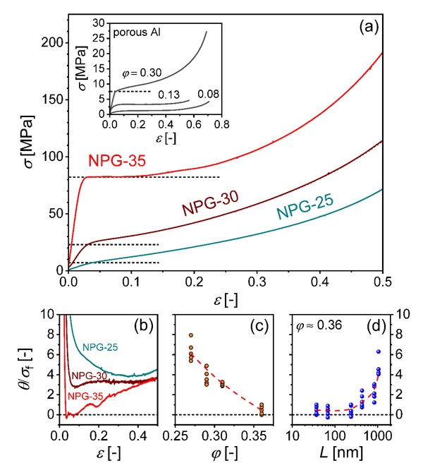 圖1. 納米多孔金的壓縮變形行為。(a) 不同相對密度納米多孔金的壓縮應力應變曲線。小圖為不同相對密度常規(guī)多孔鋁的壓縮應力應變曲線。(b) 不同相對密度納米多孔金歸一化后的加工硬化率隨壓縮應變的變化情況。(c) 納米多孔金歸一化加工硬化率隨相對密度的變化。(d) 相對密度為0.36的NPG-35樣品的加工硬化率隨孔棱尺寸的變化情況。
