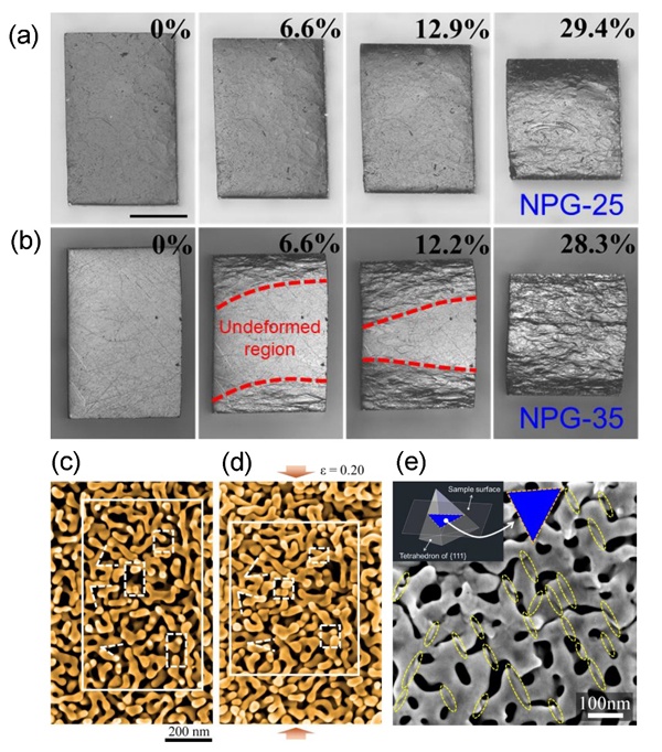 圖2. 納米多孔金的均勻與非均勻變形。相對密度為0.27的NPG-25樣品 (a) 和相對密度為0.36的NPG-35樣品 (b) 壓縮不同應變后的表面形貌光鏡照片。(c-d) 為NPG-25樣品壓縮20%前后局部變形情況?梢娍桌獍l(fā)生彎曲變形和懸掛孔棱發(fā)生搭接。(e) 壓縮10%的NPG-35中,變形帶內(nèi)的孔棱發(fā)生位錯雪崩式滑移變形的痕跡。