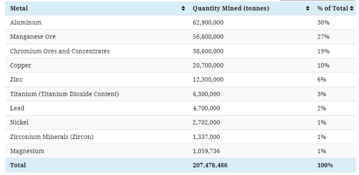 根據(jù)英國地質(zhì)調(diào)查局的數(shù)據(jù),2019年開采的所有金屬和金屬礦石如下: