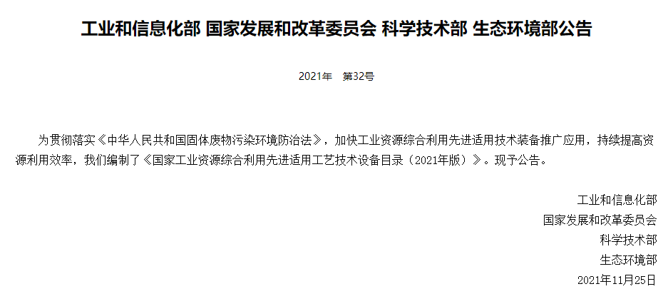 中國粉體網(wǎng)訊 為貫徹落實《中華人民共和國固體廢物污染環(huán)境防治法》,加快工業(yè)資源綜合利用先進適用技術(shù)裝備推廣應(yīng)用,持續(xù)提高資源利用效率,工業(yè)和信息化部、國家發(fā)展和改革委員會、科學(xué)技術(shù)部、生態(tài)環(huán)境部聯(lián)合編制了《國家工業(yè)資源綜合利用先進適用工藝技術(shù)設(shè)備目錄(2021年版)》。