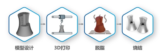 升華三維推出了“3D打印+粉末冶金”相結(jié)合的金屬·陶瓷間接3D打印技術(shù)——粉末擠出打印技術(shù)(Powder Extrusion printing,PEP)。PEP技術(shù)利用了已發(fā)展超過30年的金屬·陶瓷粉末注射成形技術(shù)(PIM)。兩者工藝流程有很多相通之處,結(jié)合3D打印對(duì)材料的控制和成形,實(shí)現(xiàn)最終的金屬·陶瓷零部件個(gè)性化定制化生產(chǎn)。在得到具有一定密度和強(qiáng)度的生坯后,利用粉末注射成形技術(shù)的相關(guān)工藝對(duì)產(chǎn)品進(jìn)行脫脂和燒結(jié),獲得性能一致且優(yōu)良的產(chǎn)品。通過3D打印實(shí)現(xiàn)無模具化的模型制備,節(jié)省了模具開發(fā)的制造成本和時(shí)間成本。PEP技術(shù)同時(shí)也彌補(bǔ)了傳統(tǒng)激光3D打印的效率缺陷與尺寸限制,成本更低,有望成為金屬零件批量打印的重點(diǎn)技術(shù)。