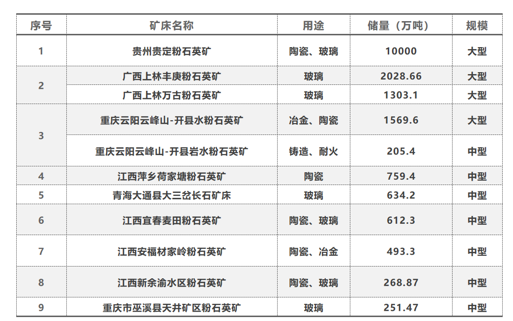 因粉石英的演變自硅質(zhì)巖,故在分布方面我國粉石英礦同硅質(zhì)巖存在緊密聯(lián)系。在地質(zhì)分布方面,我國南方硅質(zhì)巖由震旦系至二疊系,然而在硅質(zhì)巖中最易于演變?yōu)榉凼⒌臑槎B系與石炭系。從地理分布上看,已探明的粉石英礦床分布以南方為主,集中于重慶、江西、貴州、廣西、福建、青海、湖南等地。