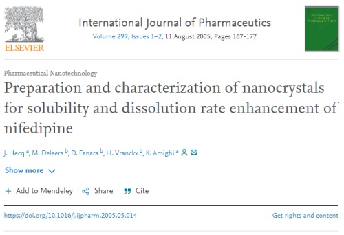[5] Hecq, J., Deleers, M., Fanara, D., Vranckx, H., & Amighi, K. (2005). Preparation and characterization of nanocrystals for solubility and dissolution rate enhancement of nifedipine. International journal of pharmaceutics, 299(1-2), 167-177.