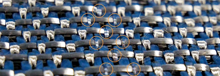 Nicalon 纖維(帶圓圈)在由 12K PAN 纖維組成的 8 層正交 3D 機織紡織品中用作接結(jié)紗