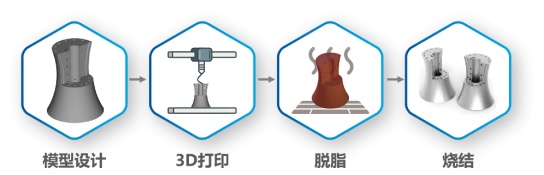 升華三維推出了“3D打印+粉末冶金”相結(jié)合的金屬·陶瓷間接3D打印技術(shù)——粉末擠出打印技術(shù)(Powder Extrusion printing,PEP)。PEP技術(shù)利用了已發(fā)展超過(guò)30年的金屬·陶瓷粉末注射成形技術(shù)(PIM)。兩者工藝流程有很多相通之處,結(jié)合3D打印對(duì)材料的控制和成形,實(shí)現(xiàn)最終的金屬·陶瓷零部件個(gè)性化定制化生產(chǎn)。在得到具有一定密度和強(qiáng)度的生坯后,利用粉末注射成形技術(shù)的相關(guān)工藝對(duì)產(chǎn)品進(jìn)行脫脂和燒結(jié),獲得性能一致且優(yōu)良的產(chǎn)品。通過(guò)3D打印實(shí)現(xiàn)無(wú)模具化的模型制備,節(jié)省了模具開發(fā)的制造成本和時(shí)間成本。PEP技術(shù)同時(shí)也彌補(bǔ)了傳統(tǒng)激光3D打印的效率缺陷與尺寸限制,成本更低,有望成為金屬零件批量打印的重點(diǎn)技術(shù)。