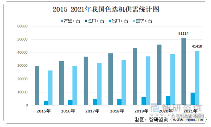 由于技術(shù)壟斷,我國色選機設(shè)備研發(fā)較發(fā)達國家起步晚。2000年以來,國內(nèi)色選機生產(chǎn)企業(yè)進入快速增長期,國內(nèi)生產(chǎn)廠家也越來越多,打破了國外色選機行業(yè)長期的技術(shù)和市場壟斷,逐步實現(xiàn)進口替代。數(shù)據(jù)顯示,2021年我國色選機產(chǎn)量在5.11萬臺左右,同期國內(nèi)出口為9724臺,進口為20臺,國內(nèi)需求總量為4.14萬臺。目前,亞洲是全球最大的色選機市場。2021年中國色選機市場規(guī)模達58.26億元,同比增長5.22%。