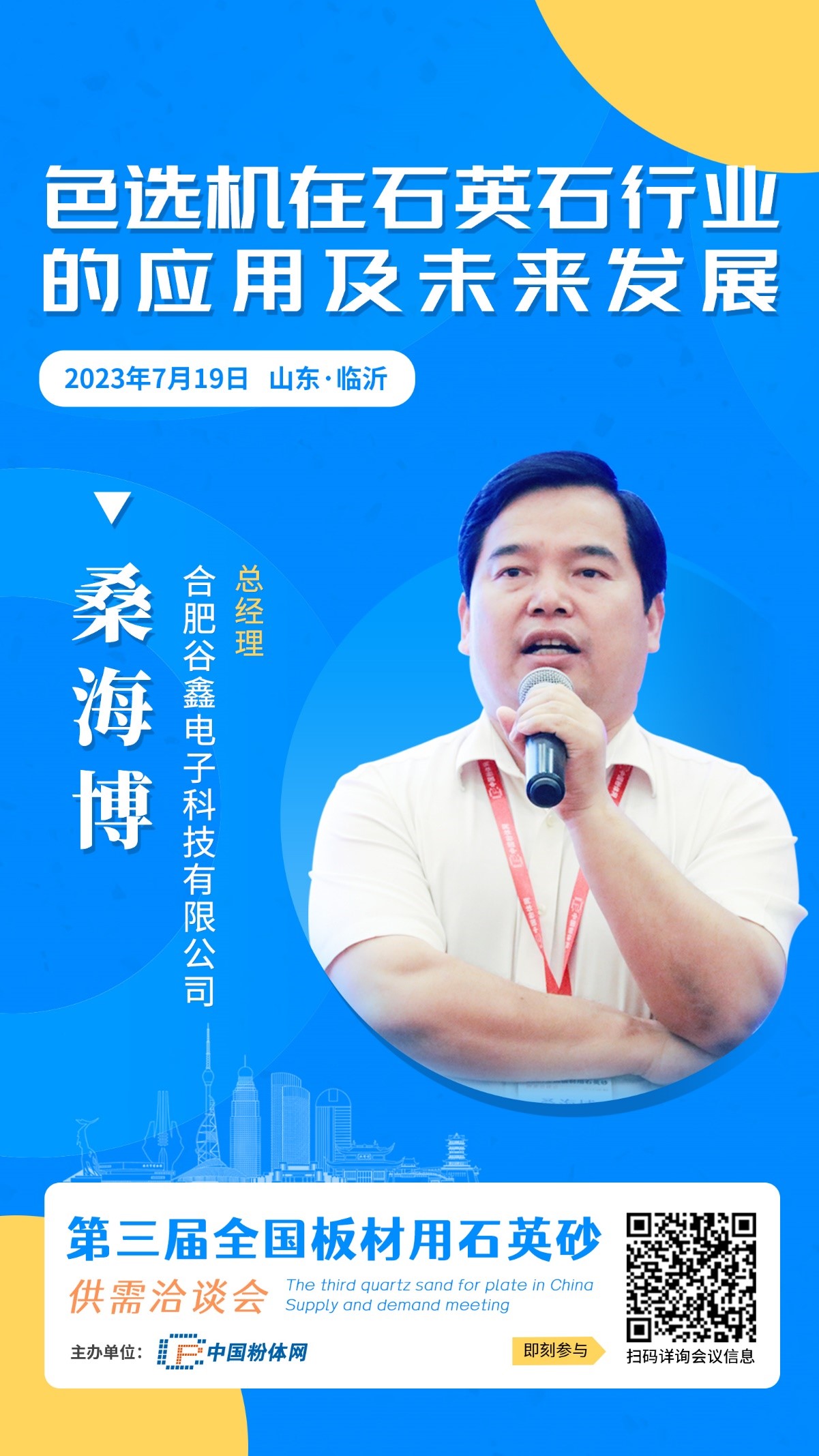 2023年7月,中國粉體網(wǎng)將在山東臨沂舉辦“第三屆全國板材用石英砂供需洽談會”。來自合肥谷鑫電子科技有限公司的總經(jīng)理桑海博將帶來題為《色選機在石英石行業(yè)的應用及未來發(fā)展》的報告。