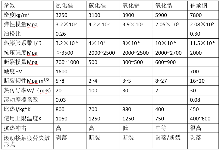 ▲不同陶瓷材料與軸承鋼的特性對比