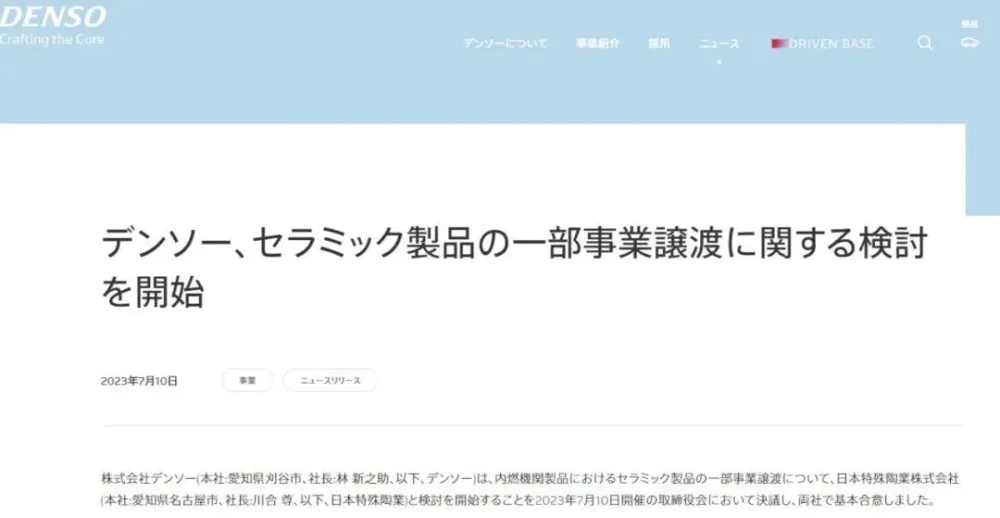 中國(guó)粉體網(wǎng)訊 繼燃油泵業(yè)務(wù)后,日本汽車(chē)零部件巨頭電裝集團(tuán)正繼續(xù)剝離出售其他與內(nèi)燃機(jī)相關(guān)的零部件業(yè)務(wù)。7月10日,電裝集團(tuán)宣布,公司董事會(huì)已決定,就出售內(nèi)燃機(jī)相關(guān)的陶瓷制品部分業(yè)務(wù),與日本特殊陶業(yè)公司展開(kāi)談判,雙方基本達(dá)成共識(shí),將圍繞具體的出售協(xié)議進(jìn)行進(jìn)一步的協(xié)商。