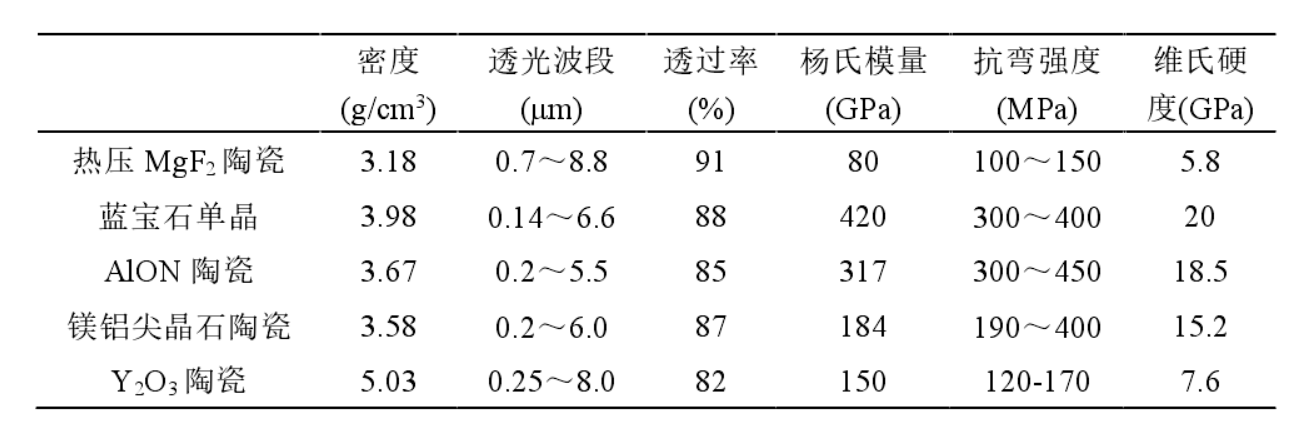 為了應(yīng)對(duì)未來(lái)戰(zhàn)場(chǎng)錯(cuò)綜復(fù)雜的情況,軍用紅外光電系統(tǒng)需要能夠滿足不同嚴(yán)苛要求,其中紅外窗口和紅外整流罩是保護(hù)光電系統(tǒng)的重要部件。在不同紅外波段應(yīng)用的材料種類(lèi)也是不一樣的,目前已經(jīng)開(kāi)發(fā)出的中波紅外材料主要有MgF2、MgAl2O4、AlON和Y2O3透明陶瓷和藍(lán)寶石單晶等;長(zhǎng)波紅外透明材料主要是ZnS、ZnSe、CdTe等透明陶瓷。