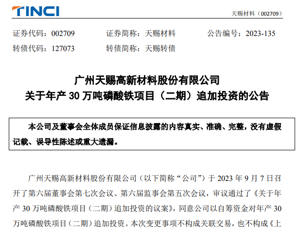 9月7日天賜材料公告,公司于2022年4月13日召開了第五屆董事會第二十八次會議、第五屆監(jiān)事會第二十一次會議,審議通過了《關(guān)于投資建設(shè)年產(chǎn)30萬噸磷酸鐵項目(二期)的議案》,公司擬通過控股子公司宜昌天賜高新材料有限公司(以下簡稱"宜昌天賜")投資建設(shè)"年產(chǎn)30萬噸磷酸鐵項目(二期)",項目總投資為100,495.27萬元,其中建設(shè)投資為89,584.27萬元,鋪底流動資金為10,911.00萬元。